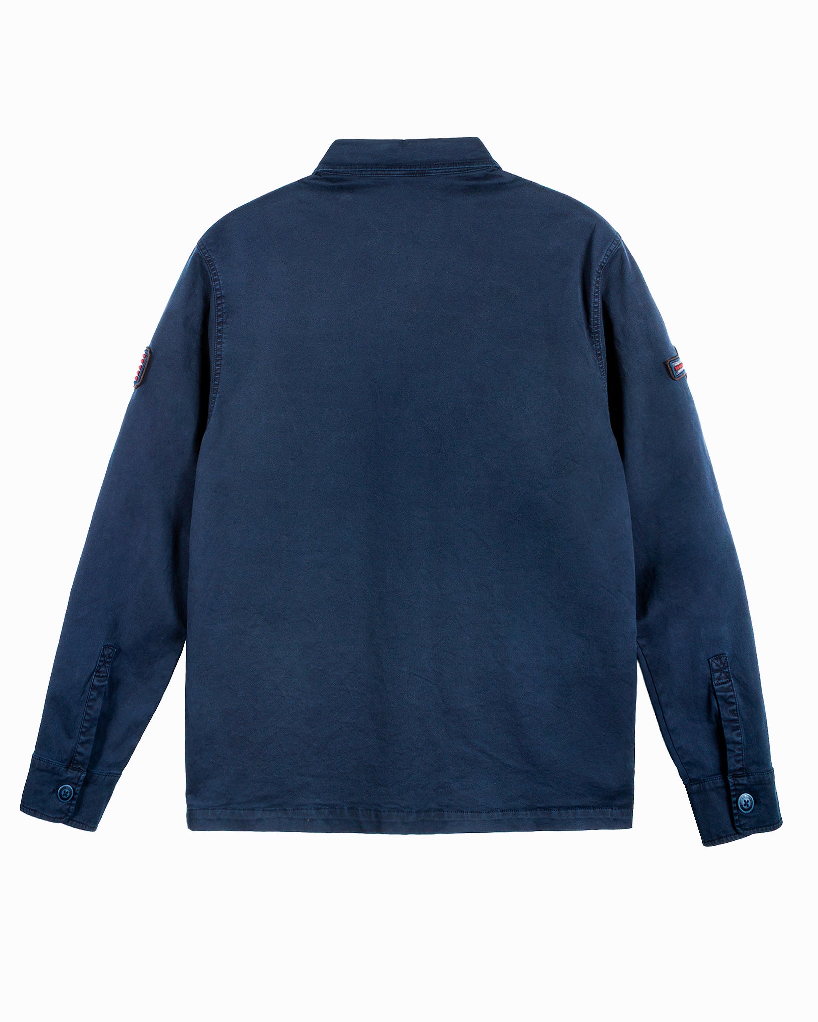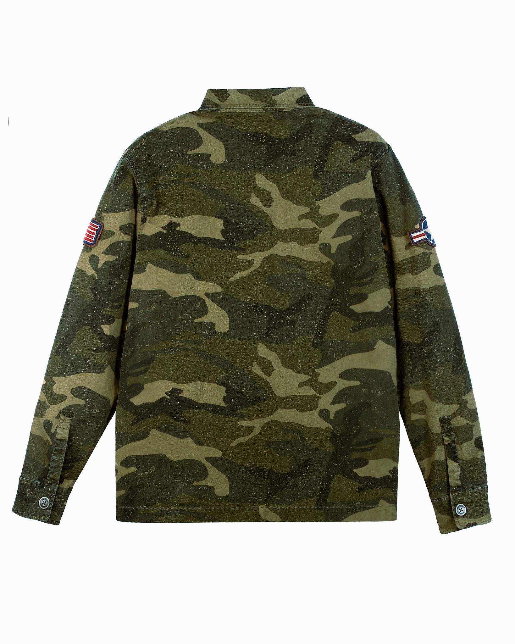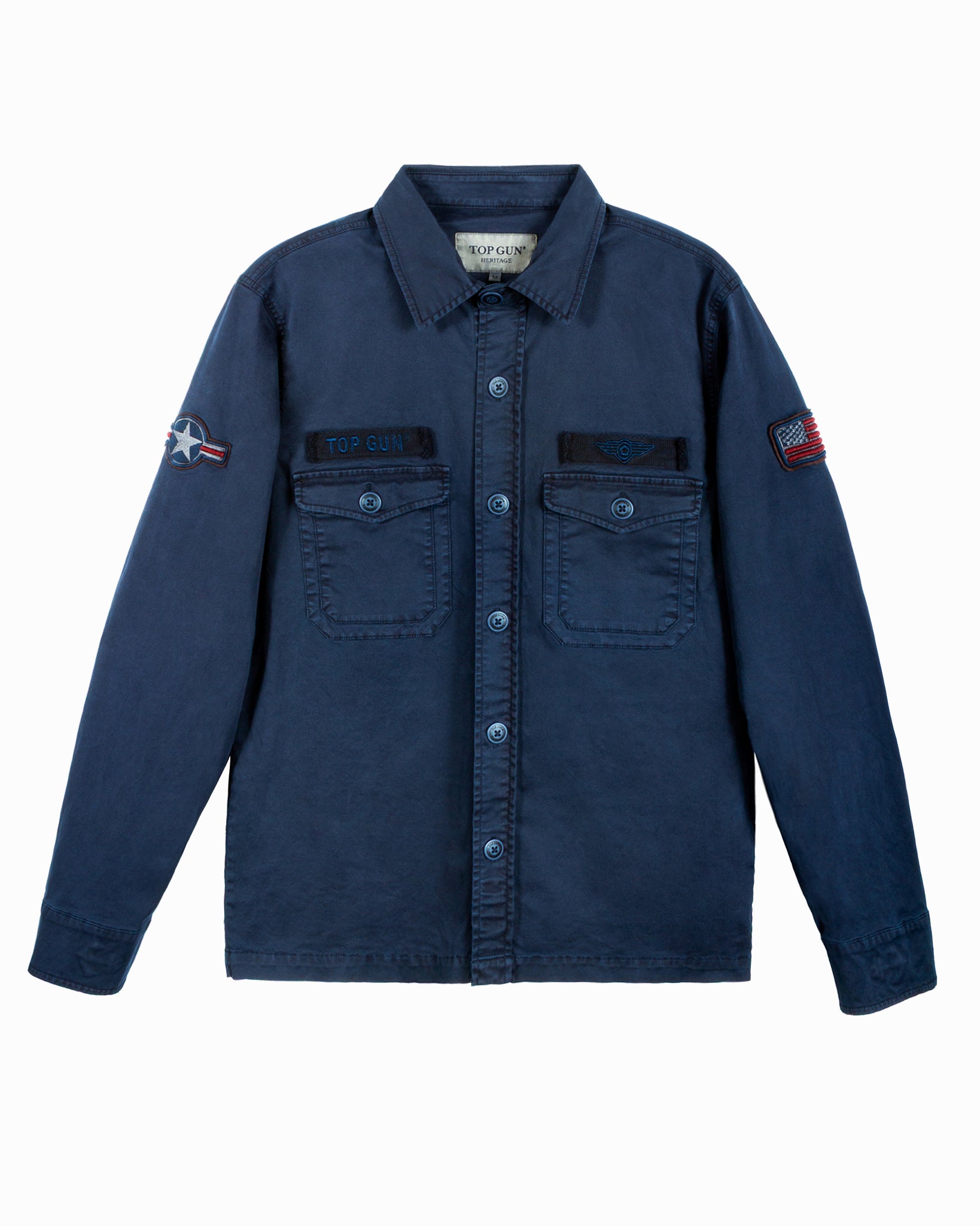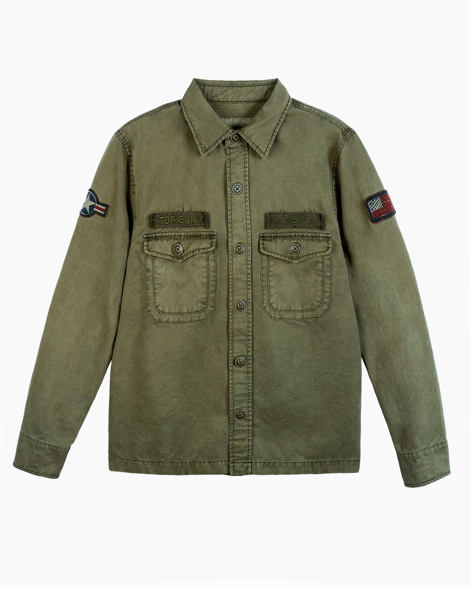 Vintage-washed cotton shirt with a rugged finish. Designed with a button-front closure, dual chest flap pockets, and distressed canvas chest strips featuring Top Gun®️ badge and wing insignia. The shoulders showcase a vintage U.S. flag patch and a U.S. Navy star-wing emblem for authentic military character.