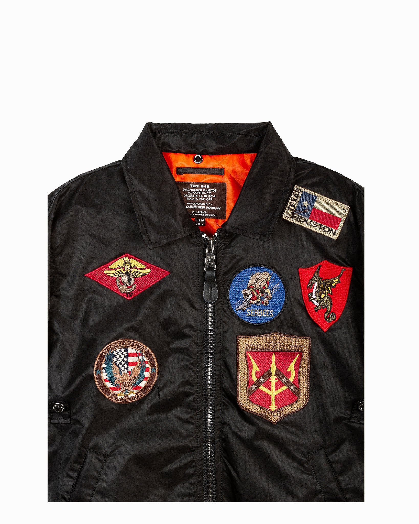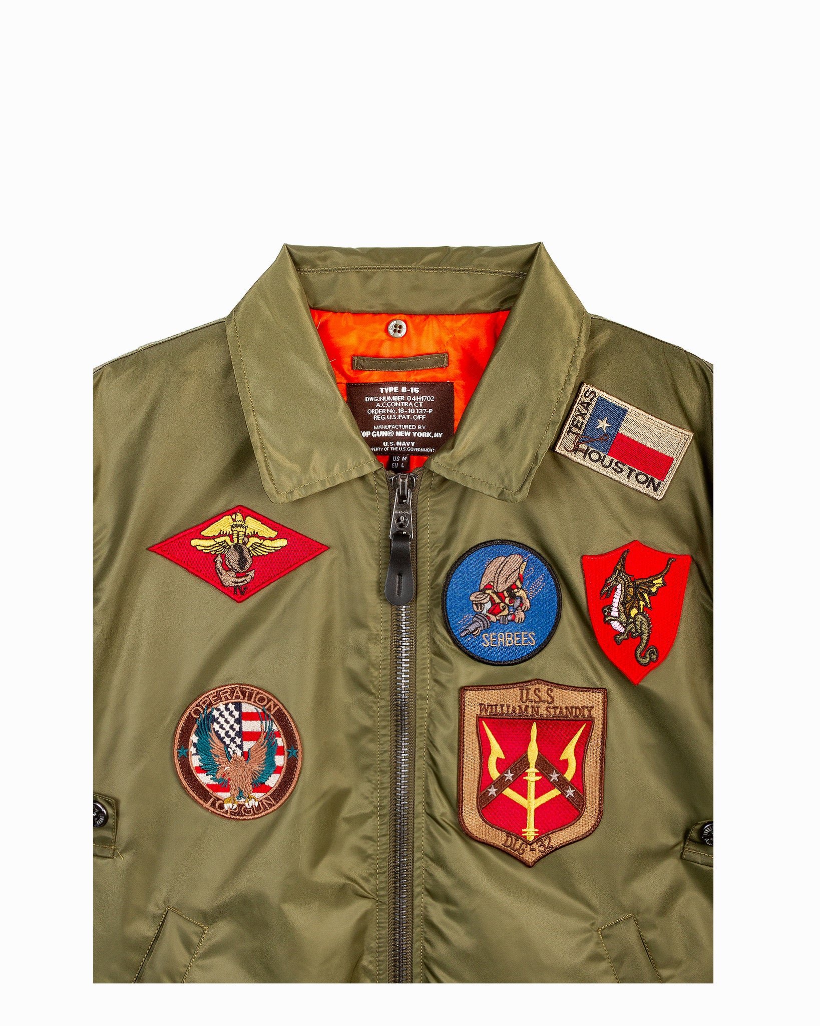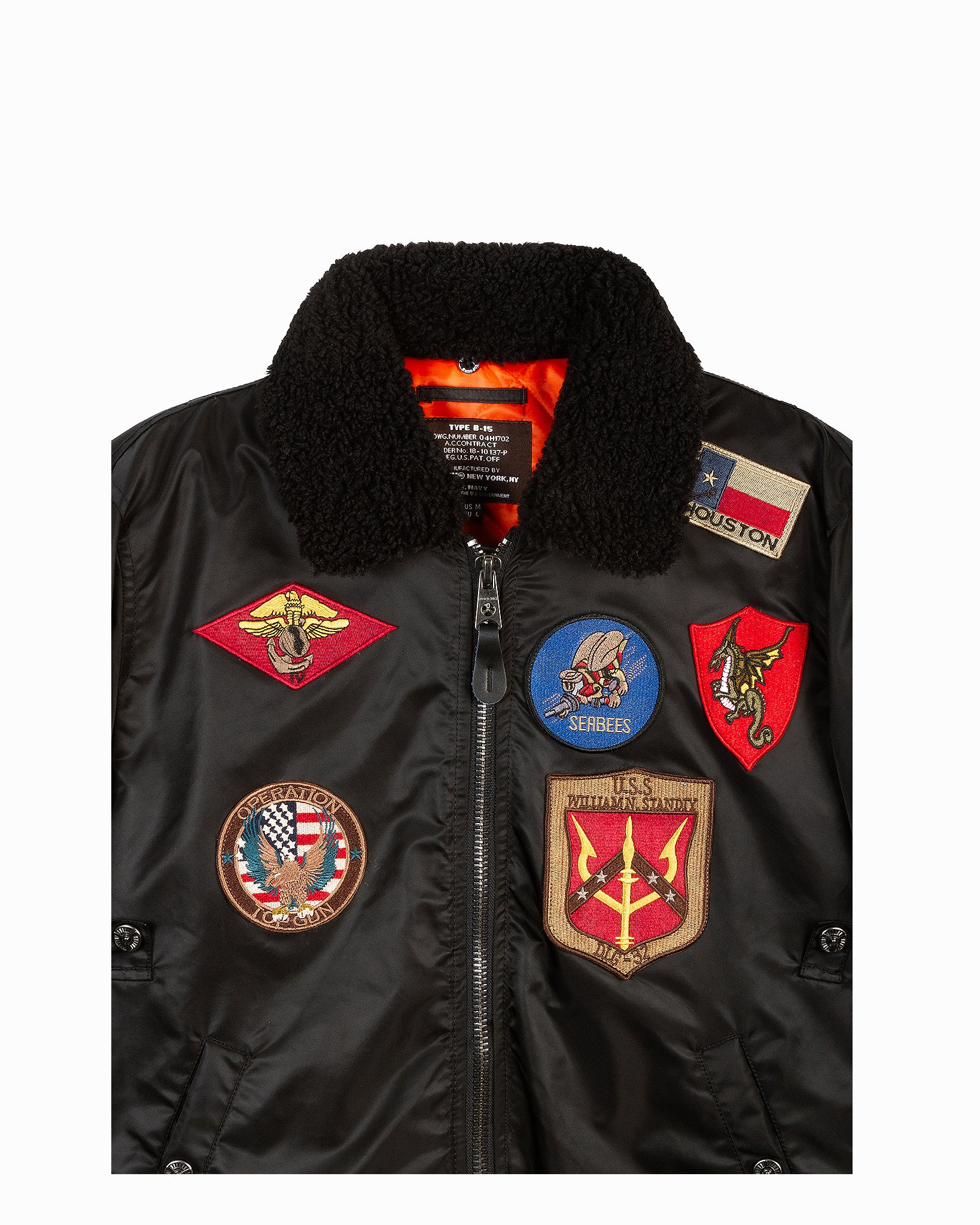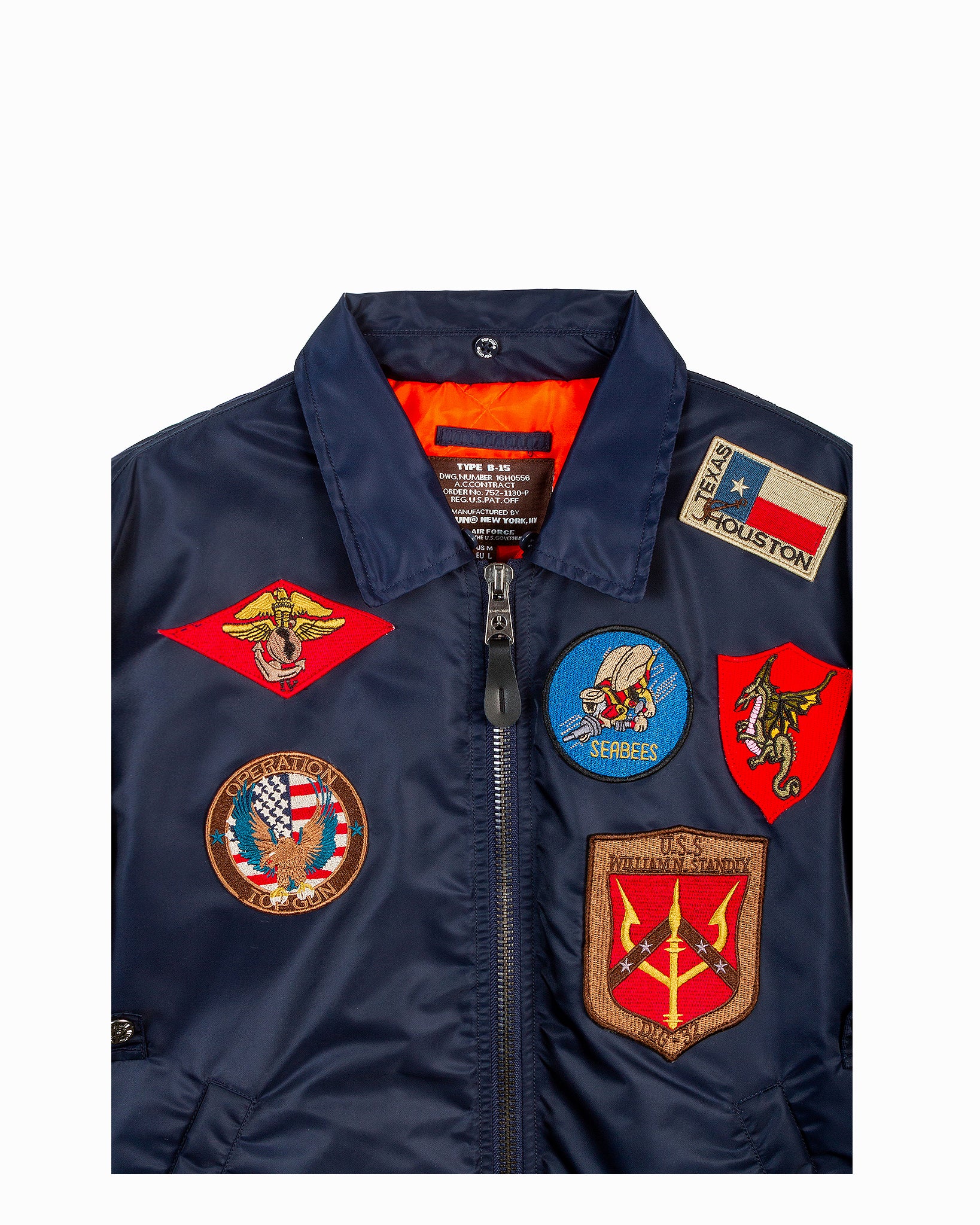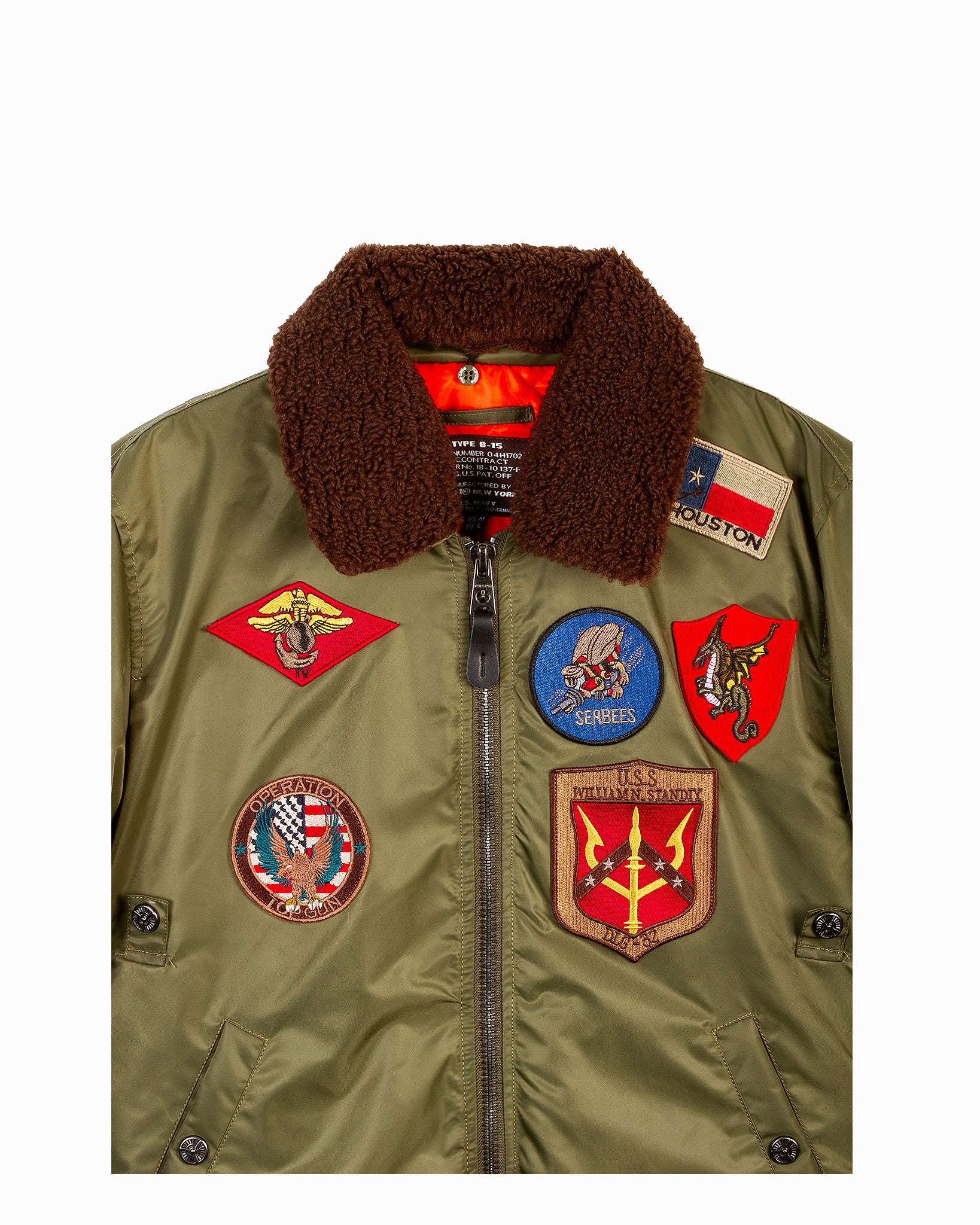 Our Top Gun® B-15 jacket has been recreated with assorted patches exclusively made for this version. Developed around 1944, the B-15 was the first nylon flight jacket designed to ensure maximum warmth for Air Force pilots.This jacket comes with 2 removable furs.